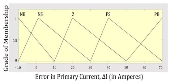 35] that represent the linguistic variables NB (Negative Big), NS (Negative Small), Z (Zero), PS (Positive Small), and PB (Positive Big) for the input. Similarly,