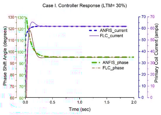 Figure 12 depicts the comparative performance of FLC and ANFIS. It presents controller responses for Case I (LTM = 30%). Both FIS and ANFIS achieve a primary current response reaching the reference value of 61.78 amps at 300 ms, displaying slight overshoot and a negligible steady-state error. Subsequently, both responses exhibit minimal vibration, with the ANFIS controller demonstrating slightly better performance compared to the FIS controller. When observing the control input (phase shift angle) for the ANFIS, it consistently follows a decreasing pattern, eventually stabilizing at 95 degrees. On the contrary, the FLC’s control input sees an abrupt drop followed by oscillations before settling at 95 degrees at 50 ms.