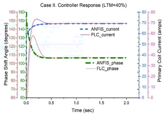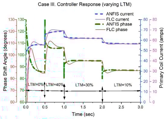 Figure 14 illustrates the responses of the controllers for Case III, where the LTM varies between 0 and 40%. The ANFIS controller adeptly tracks the primary current reference values of 55.40 amps, 61.78 amps, and 69.40 amps, displaying minimal overshoot and steady-state error. It smoothly transitions during the LTM changes at t = 0.5 s, 1 s, and 2 s. In contrast, the fuzzy controller, while noteworthy, exhibits a 30 ms delay in response to the immediate LTM change points, responding to the reference current values.