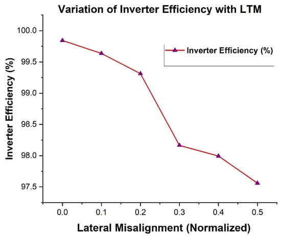 Figure 15 presents data on inverter efficiency across six different cases, corresponding to varying degrees of lateral misalignment (LTM) and duty cycles of 0.44, 0.47, 0.5, 0.55, 0.6, and 0.65. For LTM = 0 (duty cycle = 0.44), the inverter efficiency is at its highest, at 99.84%, with an input power of 25,464 W and an output power of 25,424 W. As the duty cycle increases with higher LTM values, the inverter efficiency decreases slightly. For LTM = 0.1 (duty cycle = 0.47), the efficiency drops to 99.64%. At LTM = 0.2 (duty cycle = 0.5), the efficiency further reduces to 99.31%.