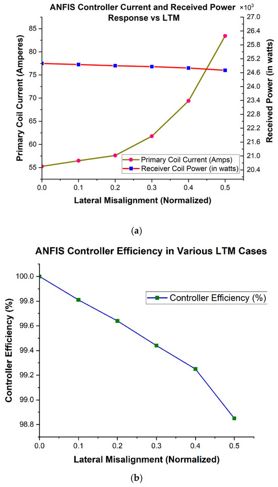 Figure 16) demonstrate the ANFIS controller’s capability to regulate the primary coil current to maintain a consistent output power of 25 kW at the receiver coil, despite varying lateral misalignments (LTM) from 0 to 0.5. At LTM = 0, the controller achieves the maximum efficiency of 100% with a primary coil current of 55.27 A and an output power of 25,000 W. As LTM increases, the primary coil current gradually rises to compensate for the misalignment and maintain the desired output power.