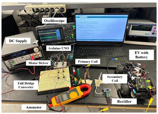 To validate the simulation results, a laboratory-scale model was developed to demonstrate the impact of misalignment and its mitigation in a DWC scenario between two EVs in a V2V system. The simulation parameters were designed to replicate real-world conditions, while the experimental setup employed a small-scale model. Despite the difference in scale, the experiment aimed to compare the performance of different controllers in both environments. This approach highlights the controllers’ effectiveness regardless of application size. The primary goal was to improve the reliability of DWC by assessing the controllers’ ability to track the reference current and adjust the PWM signal to deliver a constant power of 50 watts to the receiving EV under coil misalignment conditions.