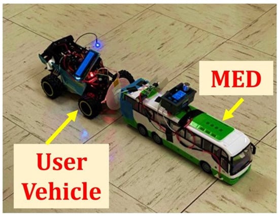 The experimental setup included an IRFZ44n MOSFET-based H-bridge inverter, an IRS2184 gate driver, an Arduino Mega 2560 microcontroller (Texas Instruments, Dallas, TX, USA), and MATLAB 2023b software for generating a PWM signal based on lateral misalignment. Additionally, it comprised transmitting and receiving coils attached to the source (MED) and receiving (User) EVs, a rectifier circuit, and a battery pack, as shown in