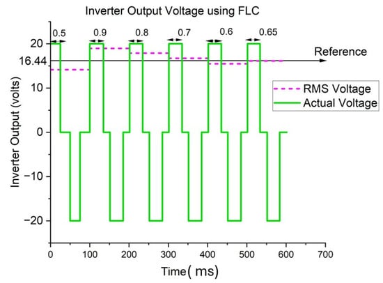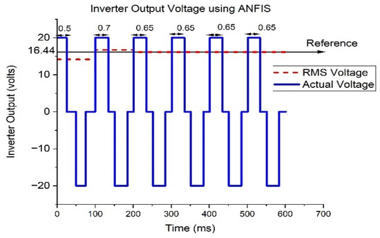 Figure 18). Under perfect alignment (with no lateral misalignment), the PWM inverter’s duty cycle was set to 0.5. To adjust for the 40% misalignment, the ANFIS controller modified the PWM duty cycle from 0.5 to 0.65 within 200 microseconds, whereas the FLC took 500 microseconds, as illustrated in