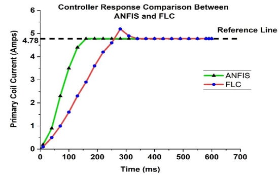 Figure 21 demonstrates the current response of both controllers, where the ANFIS controller stabilized the primary coil current to 4.78 amps at 150 milliseconds, while the FLC showed oscillations, overshoot, and a slower convergence time. It settled down to its required current value at 350 ms.