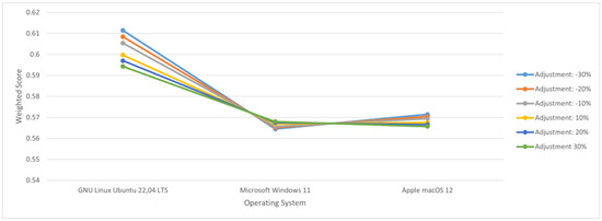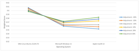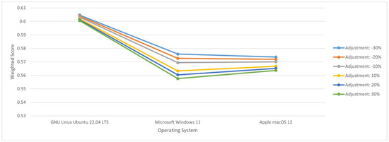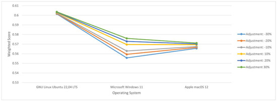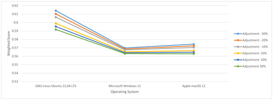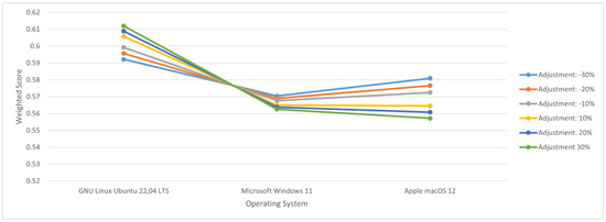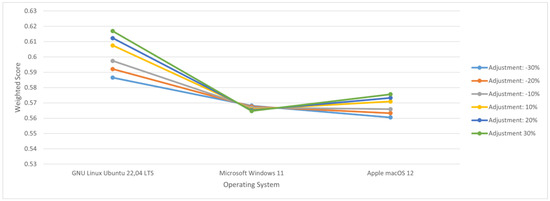 To assess the robustness of the proposed decision-making model, a comprehensive sensitivity analysis was conducted. This analysis examined how variations in the weights of each of the seven criteria affected the final rankings of the three evaluated operating systems: GNU Linux Ubuntu 22.04 LTS, Microsoft Windows 11, and Apple macOS 12.