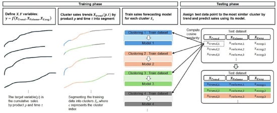 Our proposed sales forecasting model for new products is an ensemble model based on data homogeneity. The methodology consists of two stages: the training phase and the testing phase. Figure 1 illustrates these stages for predicting new product sales. In the left panel of Figure 1, the curves represent the cumulative sales volume (y) of different products (p) over time (t), where the x-axis corresponds to time (t) in weeks, and the y-axis corresponds to cumulative sales volume (y). These curves highlight sales trends, which are used to cluster products with similar trajectories for more accurate forecasting.