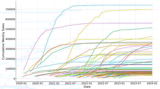 We collected weekly cumulative sales data for 79 smartphone products in South Korea from 1 January 2020 to 31 December 2023. These data were provided by one of the three major mobile carriers in South Korea. The dataset consists of 10,012 data points, focusing on models released after 1 January 2020. Figure 2 illustrates the cumulative weekly sales for each product. Each product has a different launch date, so the starting point of sales varies, as does the cumulative sales growth rate across products.