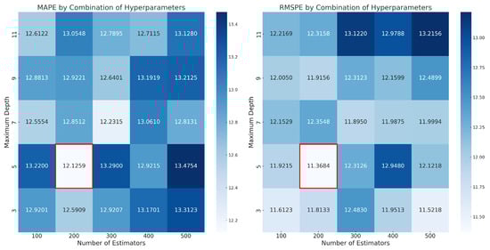 As shown in Figure 3, the average validation MAPE and RMSPE across all inner loop folds identified the optimal configuration with 200 estimators and a tree depth of five. This configuration minimized the average validation MAPE and RMSPE to 12.1259% and 11.3685%, respectively. This optimal configuration was then applied to train the model on the entire training set in the outer loop, and its performance was evaluated on the test set.