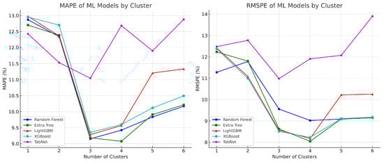 Using the nested LOOCV framework, five machine learning models were evaluated across cluster configurations ranging from one to six clusters. The inner loop was used to optimize hyperparameters and calculate the validation MAPE and RMSPE for each model, while the outer loop evaluated the final generalization performance of these models on the test dataset. Figure 4 illustrates the Test MAPE and RMSPE results for the machine learning models across different cluster configurations. The Extra Tree model, trained using four clusters, achieved the best Test MAPE and RMSPE values: 9.0779% and 8.0480%, respectively.