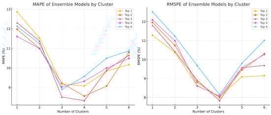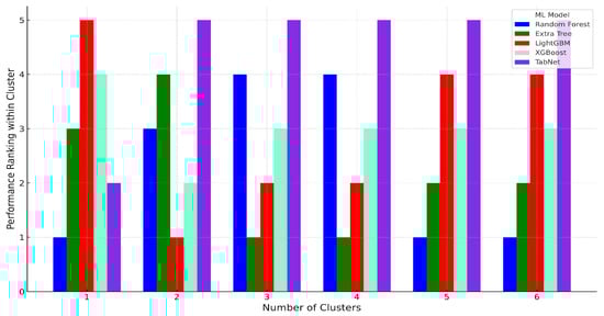 In contrast, the Random Forest model, which did not account for data homogeneity with its single-cluster approach, achieved MAPE and RMSPE values of 12.8683 and 11.2790, respectively. The four-cluster-based Extra Tree models demonstrated a 29% improvement in MAPE and a 28% improvement in RMSPE compared to the single-cluster Random Forest model. This significant enhancement underscores the benefits of segmenting the dataset into homogeneous clusters for better prediction accuracy. To further improve prediction accuracy, we developed an ensemble model by combining the top-performing models. We selected the “Top N” models based on their combined performance in minimizing MAPE and RMSPE across different cluster counts, as evaluated on the validation dataset. This selection process began by ranking the models according to the lowest total MAPE and RMSPE values achieved for each cluster configuration on the validation dataset. Figure 5 displays the ranking of the machine learning models based on validation performance across various cluster numbers.