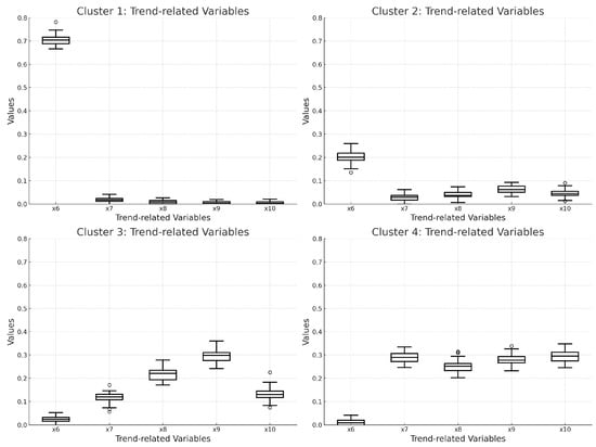 To further investigate the explanatory power of the pattern homogeneity-based prediction model, an in-depth analysis was conducted using a specific LOOCV (Leave-One-Out Cross-Validation) scenario. In this scenario, product was designated as the test dataset, while products to were used for training. Clustering configurations optimized for the number of clusters revealed that the four-cluster setup consistently delivered the best performance. To analyze the characteristics of trend-related variables within each cluster, the median values of these variables were derived, as depicted in Figure 7. This approach highlights the distinct behavior of each cluster, offering a clear segmentation of life cycle stages and their respective sales dynamics.