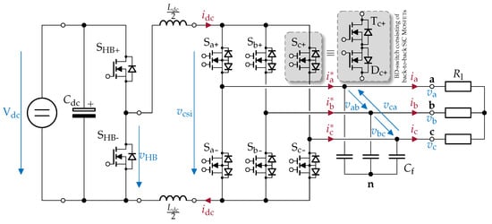 A promising alternative to the conventional VSI with its limitation is the application of a current source inverter (CSI) topology, as discussed in [3,4,5]. The CSI inherently filters the output quantities, i.e., inverter output voltages and output currents, mitigating the negative effects of high switching frequencies. Comparisons of the pros and cons of the VSI and CSI topology have already been extensively covered in [6,7,8]. Figure 1 shows the basic structure of a three-phase CSI supplied by a buck-stage from a DC voltage source. The DC-link inductor, , is split between the positive and negative DC-rails and serves as the primary energy storage element. By appropriately controlling the buck-stage, the DC-link current, , is maintained at a nearly constant value. Using pulse-width modulation (PWM) in the inverter stage, this constant DC current is then shaped into arbitrary three-phase current waveforms, , , and , which are finally delivered to the load. The capacitors are required for basic operation of the structure and filter the output voltage, thus eliminating the need for additional output filters.