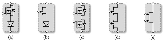 The reverse blocking switches can also be implemented using IGBTs. Standard IGBTs do not show reverse-blocking capability and specially designed reverse-blocking IGBTs show an increased forward voltage drop and are not widespread. A combination of a conventional IGBT and a diode similar to Figure 2a,b would, of course, be possible; however, it would suffer from the forward voltage drop of two bipolar devices, and the limited switching frequency of a few tens of kHz of these devices would greatly increase the required DC-link inductance, compromising the power density of the prototype system.