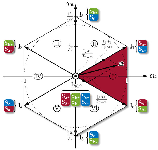 The six space vectors of the active states divide the complex plane into six sectors, to , with each sector bounded by two space vectors denominated with for the vector in the counter-clockwise direction and in the clockwise direction (e.g., sector is bounded by and ). An arbitrary space vector can be synthesized as a linear combination of the surrounding vectors, i.e., the two vectors bounding the sector in which the desired space vector resides and one zero space vector. In this article, the term modulation index refers to M, the term angle of the modulation index denotes , and the term complex modulation index represents .