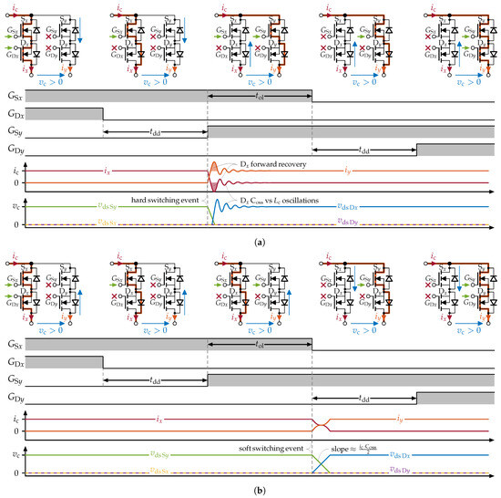 In the initial state of both commutation processes, the two switches, and , are on, allowing to flow through branch x. Depending on the polarity of , either (see Figure 4a) or (see Figure 4b) blocks the voltage in this state. To prevent a short circuit of , is turned off in the first step, causing to transition from the MOSFET channel to its body diode. After the diode delay time elapses, is activated in the second step for the overlap duration , during which both active switches and are turned on simultaneously. In Figure 4a, where is positive, undergoes a hard commutation to branch y immediately. As the current in branch x decays, charge carriers in the junction are cleared (forward recovery), momentarily resulting in negative current flow. Following this, takes over the voltage , with its output capacitance oscillating against the inductance of the commutation loop . For simplicity, these parasitic elements are omitted from Figure 4. Finally, in the third step, can be turned off losslessly.