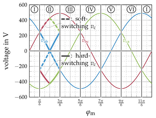 Ideal line-to-line voltage waveforms at unity power factor. For sector , the switching voltages for the respective commutation sequence are displayed according to Table 2. Solid bold lines indicate hard switching events in sector whereas dashed lines indicate soft switching events.