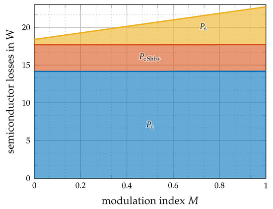 where denotes the PWM switching frequency and and represent the constants for hard and soft switching, respectively, as defined in the proposed switching loss model in Equation (2). The current is the maximum average DC-link current, and is the maximum RMS value of the output phase voltage. For a switching frequency of kHz and a maximum RMS output voltage of , the switching losses can be estimated to . If the output voltage is assumed to change linearly with the modulation index, e.g., for resistive loads, the switching losses over the entire output load range can also be estimated. A graphical representation of these losses is shown in Figure 7, where the switching losses are stacked on top of the later calculated conduction losses.