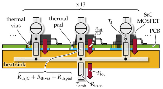 Considering the thermal management system (heat-sink and fans), the temperature rise—and consequently, the increase in and conduction losses can be estimated iteratively. The first step is to gather the thermal resistance data for each thermal interface. SMD-mounted, bottom-side-cooled MOSFET devices are used—i.e., the thermal resistances of the thermal vias as well as the thermal resistances of the interface material from the PCB to the heat sink have to be considered next to the thermal resistance of the MOSFET itself. According to the technical datasheet, each of the 13 semiconductor switches (12 switches in the inverter and the half-bridge top switch) has a thermal junction-to-case resistance of . Not only the thermal resistance of the MOSFETs has to be considered but also the thermal vias beneath the SMD-mounted devices. The thermal resistance of the vias beneath the TO-263-7 packages is estimated to , and the thermal resistance of the interface pad between the heat sink and PCB is . The thermal resistance of the pure-copper heat sink to ambient air, based on its geometry and fan airflow rate of , is . A graphical representation of the thermal stackup including all thermal resistances is shown in Figure 8.