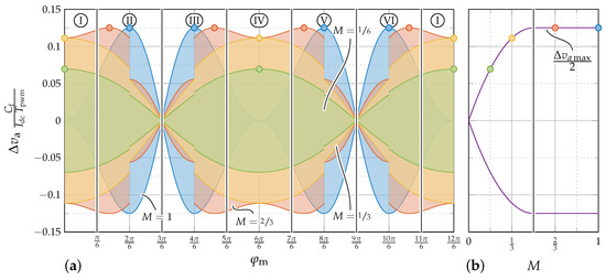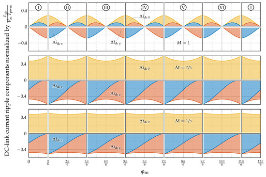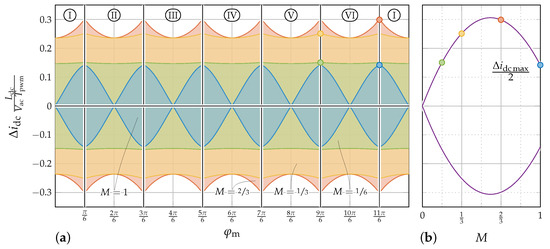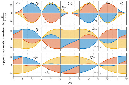 A graphical representation of the normalized ripple for different modulation indices is given in Figure 10 for the applied modulation strategy also highlighted in Table 2. Note that the steps in the curves at , , , and are caused by the transitions of the modulation scheme according to Equation (14).