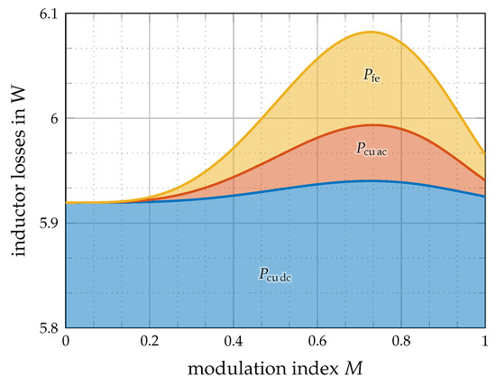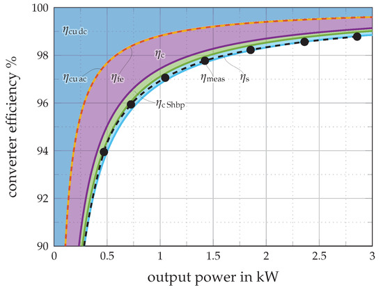 In addition to the measured results, the theoretically calculated efficiencies for each loss component analyzed in the preceding sections are displayed as colored areas. The efficiency areas are calculated by taking the semiconductor switching losses , conduction losses and , inductor core losses , and inductor DC and AC copper losses and from Figure 16 and converting them into the respective efficiency curves via . Here, the modulation index dependent converter AC output power corresponds to . The efficiency of the converter reaches its maximum at approximately 98.8% at the nominal operating point of . As the output power decreases, the efficiency decreases, but maintains a value of 97.9% at 1.5 kW.