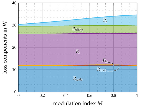 Power semiconductor switching and conduction losses at different modulation indices M for a linear load model.
