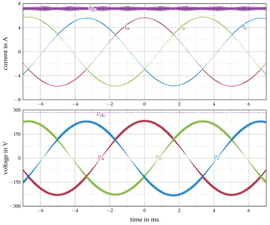 The measured current and voltage waveforms for an output power of ( of the nominal load) are shown in Figure 18 for a modulation index of . Please note that the phase voltages were calculated from the measured line-to-line voltages.