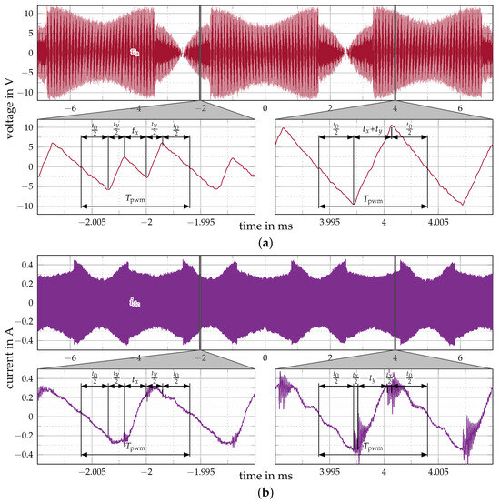 - The DC-link current , the input voltage , the three output currents , , and , as well as the line-to-line output voltages , , and were measured using an oscilloscope (Tektronix 5 Series) with appropriate current clamps and differential voltage probes, resulting in a total measurement bandwidth of 50 MHz. The phase voltage quantities , , and were subsequently calculated from the measured line-to-line voltages via , , and to be able to compare the measurement results with the analytical derivations for the phase voltage ripple.
