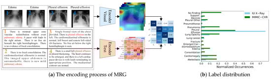 Medical report generation (MRG) utilizes advanced algorithms to automatically extract key information from medical images and generate the corresponding reports. These advances not only help clinicians to efficiently review and diagnose medical conditions, but also contribute to the broader automation of the medical imaging workflow. Similarly to the image captioning task, the main approaches in MRG are typically based on the encoder–decoder architecture, using Convolutional Neural Networks (CNNs) to extract visual features and Recurrent Neural Networks (RNNs), or their variants, to generate reports [1,2,3]. Although this method successfully captures the coarse-grained features and basic semantic structures of the images, the generated reports tend to be brief, with limited information coverage, often failing to describe subtle or complex abnormalities present in the images. In recent years, the Transformer model [4], which has gained widespread use in Natural Language Processing (NLP), has been increasingly integrated into MRG models [5,6,7,8]. The Transformers’ ability to capture long-distance dependencies and model rich contextual relationships within data has led to significant improvements in the quality of generated reports. Reports produced by Transformer-based models are typically more detailed and comprehensive, enhancing the clinical value of the generated content. The integration of attention mechanisms, particularly self-attention and cross-attention [3], allows the model to dynamically adjust its focus across different features, enabling a more effective extraction of key information from medical images and improving the accuracy of visual feature representation [6,7]. Furthermore, cross-modal alignment techniques such as cross-attention and gating mechanisms have been developed to promote the alignment of visual and textual modalities, enhancing the semantic consistency between the two. These techniques allow the model to better understand the relationships between the image content and the corresponding text, thereby improving the model’s ability to generate accurate, contextually relevant and coherent medical reports. As a result, with the advancement of these methods, substantial progress has been made in improving the accuracy, completeness, and readability of the reports generated in MRG. These contributions not only help clinicians in the efficient review and diagnosis of medical conditions but also aid in the general automation of the medical imaging workflow, streamlining the healthcare process, and reducing human error.