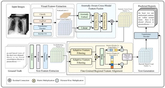 The overall structure of the model is based on a Transformer-based encoder–decoder architecture, as shown in Figure 2. It mainly consists of four components: (a) feature extraction; (b) anomaly-aware cross-modal feature fusion; (c) fine-grained regional feature alignment; (d) text generation.