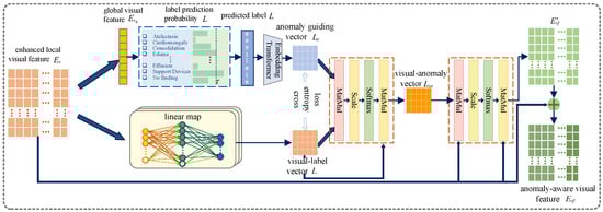 The first cross-attention operation aligns the visual-label vector with the anomaly embedding vector , generating the visual-anomaly vector . This step ensures that the anomaly embedding vector provides semantic and anomaly-specific guidance, enabling the model to focus on regions in the visual modality that correspond to specific disease categories. Next, the second cross-attention layer integrates this anomaly-aware information into the visual feature map , producing the fused anomaly-aware visual feature . This step enhances the model’s focus on critical diagnostic areas and improves cross-modal feature alignment.