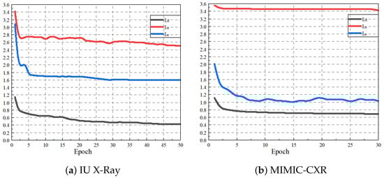 We resize the images to 224 × 224 pixels, apply center cropping, and scale the pixel values to [−1, 1]. ResNet-101 pre-trained on ImageNet [29] is used as the visual feature encoder, which divides each radiology image into 2048-dimensional patch features. A baseline model is constructed using a standard Transformer decoder as the text generator. The number of patches is 98 for the IU X-Ray dataset and 49 for the MIMIC-CXR dataset, respectively. The Transformer architecture uses eight attention heads in the encoder and decoder with a hidden dimension of 512. The model is trained over 50 epochs with a batch size of 16 using the Adam optimizer and cross-entropy loss, implemented in Python 3.7 using PyTorch 1.7.1. The learning rate for the visual extractor is , and the learning rate for other parameters is , with a decay of 0.8 per round. The dropout rate is uniformly set to 0.1 in this study. The initial values for the weights of the loss function , , and are set to 0.4, 0.4, and 0.2, respectively, and are dynamically updated during training. The temperature coefficient T for is set to 0.07. The threshold value for the labels is set to 0.8. We conduct a parameter sensitivity experiment to determine the optimal value of T, which is detailed in Section 4. The beam search size used during report generation is set to 3. The distribution of loss values and evaluation indicators are shown in Figure 5 and Figure 6, respectively, showing a continuous decline and steady progress.