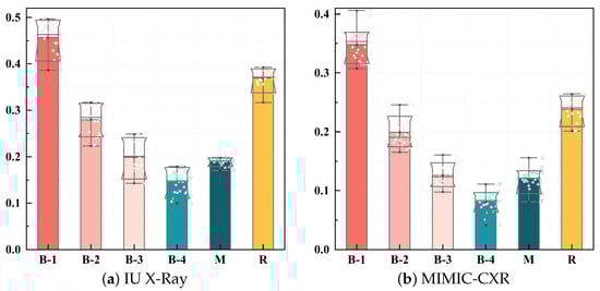 As observed, the model’s performance improves across several evaluation metrics as T increases from 0.01 to 0.07. This trend aligns with the settings used in pre-trained CLIP models, where has been shown to provide a good balance between precision and recall. However, when T is further increased beyond 0.07, the performance begins to degrade. This decline can be attributed to the model’s tendency to over-relax the similarity criteria, resulting in less accurate alignment of fine-grained image–text features. Specifically, overly large values of T cause the model to match a broader set of image–text pairs, including irrelevant ones, which reduces the overall precision. Based on these results, we conclude that is the optimal value for maintaining effective cross-modal feature alignment while ensuring robust performance in the medical report generation task.
