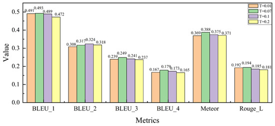 As shown in Figure 7, we analyze the impact of the temperature coefficient T, which influences the sharpness of the similarity distribution during the cross-modal contrastive loss calculation in the FRFA module. The temperature coefficient T plays a critical role in balancing the image–text alignment during training. By varying T across different values, we examine its effect on model performance.