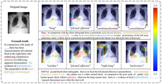 By comparing the two generated reports with the original report, we observe that the ADCNet method correctly identifies the presence of “atelectasis” in the image and accurately determines that “pneumothorax” is absent. In contrast, the BASE model misidentifies the lesion as “pleural effusion”. Moreover, the heatmap of the BASE model fails to align correctly with the key visual regions. For instance, the area corresponding to the word “lung” is noticeably misaligned, with most of the highlighted regions appearing at the lower part of the image, suggesting that the BASE model struggles to distinguish between relevant visual features. On the other hand, the heatmap generated by the ACFF module provides a more accurate alignment. For example, the locations corresponding to words like “right lung” and “pleural effusion” are correctly identified, demonstrating that the ACFF module improves visual-semantic alignment.