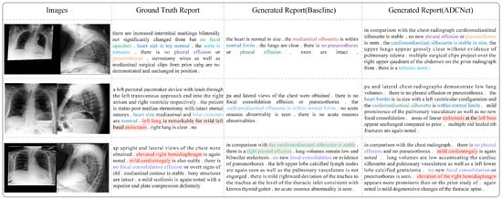 Figure 9 compares the real medical reports with those generated by the baseline model and our proposed method, ADCNet. As shown, the reports generated by ADCNet exhibit greater similarity to the real reports in terms of length, structure, and fluency. For example, in the first case, the sentences generated by the baseline model contain incomprehensible semantics, such as ’xxxx,’ which makes them difficult to understand. In contrast, ADCNet describes the image content in a more coherent and fluid manner. Moreover, ADCNet provides more comprehensive descriptions of lesions. For instance, in the second row, ADCNet accurately identifies “atelectasis”, which the baseline model fails to detect. Additionally, ADCNet demonstrates higher semantic consistency with the real reports. It not only detects the presence of diseases but also offers more precise and complete descriptions of normal conditions and anatomical structures. In the third row, the real report mentions “hemidiaphragm” and “cardiomegaly”. ADCNet successfully identifies both abnormalities and accurately describes their location and severity, correctly noting “right” and “mild”. In contrast, the baseline model fails to detect these conditions and incorrectly identifies “pleural effusion” on the right side. These results show that ADCNet significantly outperforms the baseline model in both accuracy and detail, improving the overall quality and reliability of the medical reports generated.