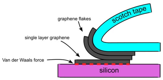 The mechanical exfoliation procedure uses a target SiO2 wafer substrate, pre-cleaned using methods such as solvent washes, sonication, and O2 plasma cleaning. The mechanical exfoliation portion of the procedure begins with bulk crystal of highly ordered pyrolytic graphite (HOPG) or other intended material and a piece of ordinary commercially available Scotch® (3M, Maplewood, MN, USA) brand adhesive tape. The adhesive tape is brought into contact with the HOPG bulk material then removed, cleaving off several flakes of the stacked layers of 2D graphene material with it. The flake-coated area of the adhesive is brought into contact with an unused portion of the tape then peeled apart. This is repeated multiple times to cleave these material stacks to a reduced amount of stacked layers. The material covered tape is then applied to the target SiO2 wafer’s surface and pressed down. The graphite layers applied to the surface of the substrate and are attracted to the SiO2 wafer through van der Waals forces. The resulting stack is then heat annealed on a hotplate at 100 ∘C for ~2 min. Annealing facilitates the migration of gas adsorbates trapped between the SiO2 surface and graphene flake, promoting larger areas of surface contact and enhancing adhesion [8,16,17].