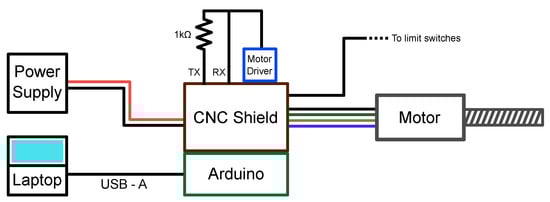 The motor system is powered by a variable DC power supply, while the Arduino is powered through the USB interface. Limit switches are connected to the Arduino to prevent the linear actuator from exceeding its physical limits and to home the actuator to a fixed position at the start of each test. Figure 3 shows the wiring diagram of the system.