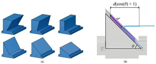 Angled substrate mounting blocks and locking base. (a) Examples of other modeled substrate mounting blocks, listed from left to right and top to bottom, at , , , , , and . Angles of any incremental degree can be modeled, 3D printed, and interchanged into the system. (b) Diagram depicts the correlation between actuator displacement and peel distance, along with an example of a block slotted into the interlocking base. Peel angles are measured from the horizontal plane and are notated as .