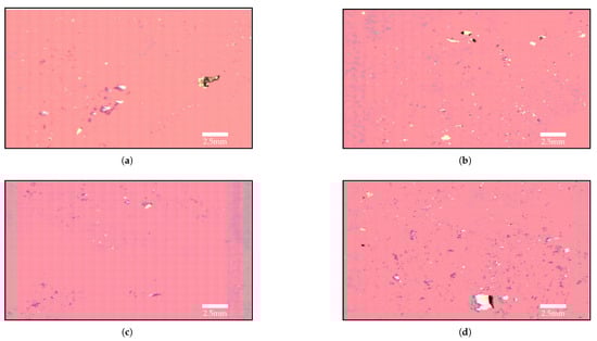 In most cases, slower peel speeds are expected to have larger amounts of residue present; however, the results in Figure 6 could be interpreted to suggest the opposite. This is possibly due to uneven contact with the hotplate during the heat annealing step of the procedure. This specific test was conducted using a single whole 100 mm SiO2 wafer to normalize the substrate comparison between each sample. During normal procedures, smaller 25 mm × 25 mm wafers are often used instead, which are not expected to have difficulty with even heat distribution.