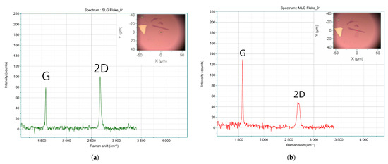 Raman spectra evaluation of flakes obtained from the system during a slow 0.01 mm/s peel at a angle. Image and data was taken using a 100× magnification lens on a Horiba Xplora Plus. (a) Single-layer graphene (SLG) characterized by a higher intensity 2D peak relative to the G peak. (b) Multi-layer graphene (MLG) characterized by the 2D peak intensity higher relative to the G peak; a higher ratio of intensity indicates more layers [16].