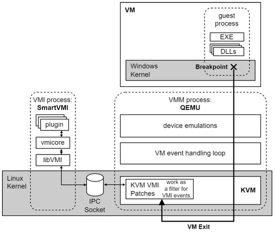 Building on our work developing a VMI infrastructure for the KVM hypervisor to realize security monitoring for Windows guests, we investigate, among other things, the various breakpoint-handling mechanisms employed in different VMI applications. In this paper, we present an overview and classification of these different methods. The VMI software stack on which we focus consists of the virtualization stacks KVM/QEMU and XEN/QEMU, and the VMI applications SmartVMI and DRAKVUF. SmartVMI [11] is a VMI application software based on libVMI, which was developed in the SmartVMI research project [12] by VMI researcher D. Eikenberg (GDATA) and partners. It provides a plugin interface and guest access functionalities to implement custom VMI monitoring logic. A VMI-based guest memory YARA scanner and a guest API call tracer are available as plugins. DRAKVUF [13] is a plugin-agnostic VMI application software for monitoring guest behavior, too. It was developed by T. Lengyel with a focus on stealthiness [14]. There are a lot of plugins and libraries available, targeting different use cases of automated malware analysis used in sandbox solutions. DRAKVUF is also built on top of libVMI but currently only supports the XEN hypervisor as a virtualization back end.