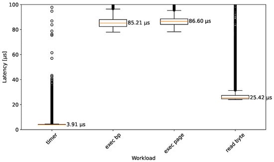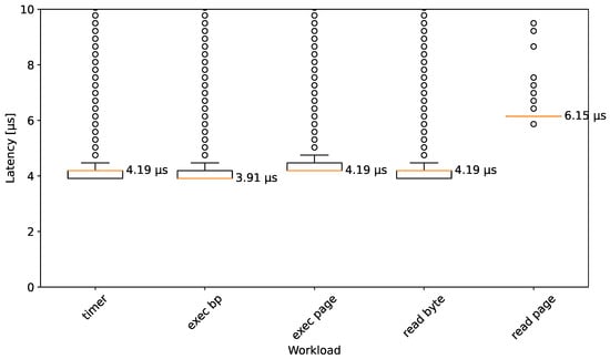 The workload “exec bp” without breakpoint measures the execution time of one CALL and one RET instruction, which, assuming the necessary memory is cached, can be executed in a few CPU clock cycles, i.e., a few nanoseconds. Accordingly, the plot is nearly identical; the lower median value can again be explained by the resolution of the timer and the duration of the timer access, which induce randomness whether 14 or 15 clock ticks are measured between two timer accesses. “exec page” has 4095 additional NOPs to execute, which are slightly noticeable in the majority of times showing 15 or 16 clock ticks. “read byte” reads only a single byte between the timer accesses; thus, its plotted box looks identical to “timer” and “exec bp”. Finally, “read page” measures the time to read 8 bytes from the breakpoint page 512 times. The majority of times, this happens in 22 timer ticks (6146 ns). Subtracting the timer offset, this equates to around 2 µs for 512 reads or around 4 ns per read.