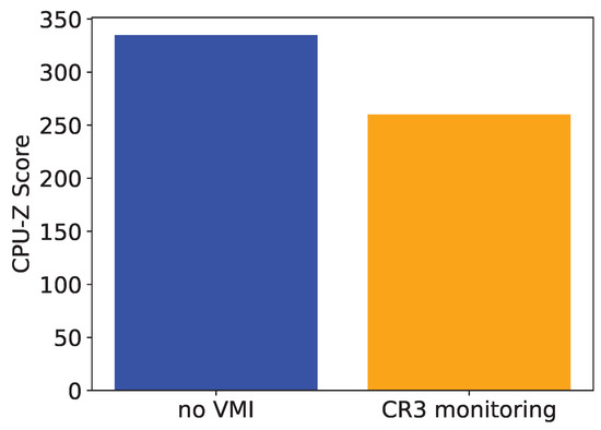 We ran the CPU benchmark of CPU-Z once without VMI active to retrieve the reference score, which the single vCPU is able to achieve. The score amounted to 334.7 points. Then, SmartVMI was activated. It did not place any breakpoints, but enabled KVM to inform it on every CR3 write. The registered callback function was empty; no additional code was executed. Running the CPU-Z benchmark under these conditions, the achieved score reduced to 259.9 points. This amounts to a performance reduction of 22.4%. The results are also displayed in Figure 7.