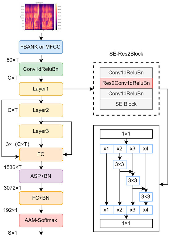 - Desplanques, B.; Thienpondt, J.; Demuynck, K. ECAPA-TDNN: Emphasized Channel Attention, Propagation and Aggregation in TDNN Based Speaker Verification. In Proceedings of the Interspeech 2020, Shanghai, China, 25–29 October 2020; pp. 3830–3834. [Google Scholar]