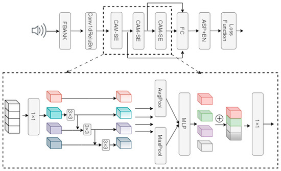 In the SE-Res2Block, after stacking multiple convolutional layers, features are fused through a combination process. However, this fusion lacks channel information from the entire network, which can lead to the loss of important feature details, affecting system performance. With ongoing research advancements, more deep residual networks and Squeeze-Excitation modules have been applied to speaker verification tasks [5,6,7]. Additionally, incorporating attention mechanisms into deep networks has become an effective method to enhance model classification performance [8,9,10]. To address these issues, we propose a Channel Attention Module Squeeze-Excitation Res2Block (CAM-SE), which introduces a channel attention mechanism into the SE-Res2Block and uses parallel global average pooling and global max pooling to capture global statistical information for each channel.