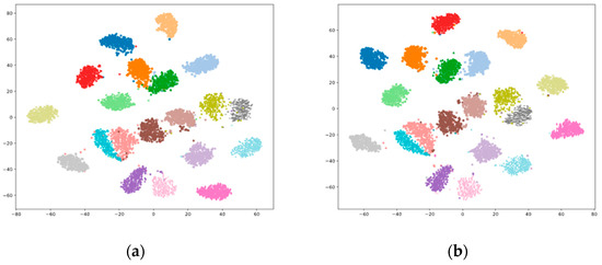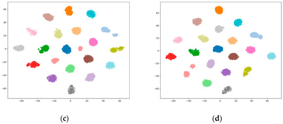 Additionally, the visualization method proposed by Maaten et al. [32] is used to reduce the dimensionality of the features extracted by the proposed CAA-TDNN system, resulting in a t-SNE visualization plot. The test set of the AISHELL-1 dataset, consisting of 7176 utterances from 20 speakers, is used for testing, with different symbols and colors representing the 20 speakers. Figure 5a shows the visualization of features extracted by ResNet34, where the features are not clearly classified, with large inter-class and intra-class distances, and many misclassifications, indicating weak classification ability. Figure 5b shows the visualization of features extracted by the Thin ResNet-34 model, with improved classification accuracy compared with Figure 5a, though the inter-class distances are still not distinct for some classes. Figure 5c shows the feature visualization from the ECAPA-TDNN model, which has larger inter-class distances, smaller intra-class distances, and a significant improvement in accuracy compared with Figure 5b. Compared to the model discussed earlier, Figure 5d shows the feature visualization from the proposed CAA-TDNN model, which has higher classification accuracy and demonstrates tighter intra-class distances and more distinct inter-class distances. This indicates that the channel attention squeeze-excitation module (CAM-SE) enhances the model’s ability to distinguish features, and the AJ-LF further improves speaker verification performance by focusing on both inter-speaker separation and intra-speaker compactness.
