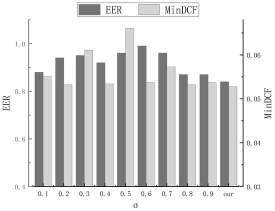 To verify the adjustment capability of the AJ-LF, in the experiment, the hyperparameter σ in Equation (6) was assigned values ranging from 0.1 to 0.9. Using the same network architecture and training method, nine different networks were trained and compared with the network using adaptive joint loss. Figure 6 shows the speaker verification performance with different values of σ. From the results, it is evident that the value of σ has a significant influence on the system. When σ is large, the contribution of AAMSoftmax becomes more important, and the model focuses more on the separation of different samples. When σ is small, the contribution of SphereFace2 becomes more important, and the model emphasizes intra-class compactness. When trained with the AJ-LF, the two losses can mutually explore their correlation to adapt to the shared parameters in the backbone network, thus learning more discriminative speaker features. A comprehensive analysis of both evaluation metrics shows that the system demonstrates the best speaker verification performance when using the AJ-LF, demonstrating the effectiveness of the proposed loss optimization method.
