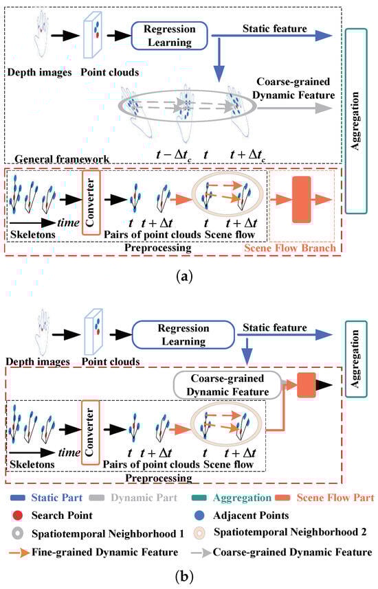 The basic idea of FSS-GR. (a) Multi-stream FSS-GR. (b) Two-stream FSS-GR. Compared with the general framework based on point clouds and FSS-GR, FSS-GR not only takes advantage of both the depth image and skeleton, but also integrates 3D motion features at different fine-grained levels. Most works learn the dynamic features of search point in Neighborhood 1. Our work fuses the fine-grained features represented by scene flow in smaller Neighborhood 2. is the frame time interval between search points and adjacent points during the learning of coarse-grained features. is the frame time interval between search (source) points and adjacent (target) points during the extraction of fine-grained features.