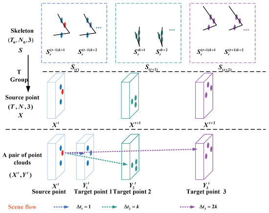 Given a dynamic gesture of frames, the skeletons of each frame are represented by the 3D coordinate vectors of hand joints. In order to obtain the scene flow of joints, firstly source point clouds X are constructed from the skeletons of T key frames in the gesture. Then, target point clouds Y are constructed from the skeletons of T frames that are distinct from the T frames of source point clouds X so that each dynamic gesture has T pairs of point clouds as described in Section 3.1.1. Finally, the flow field about point-by-point motion from X to Y is estimated by using the self-supervised scene flow estimator. Because different metrics are used to build target point clouds and measure scene flow, different types of scene flow datasets can be extracted for gesture recognition, as described in Section 3.1.2.